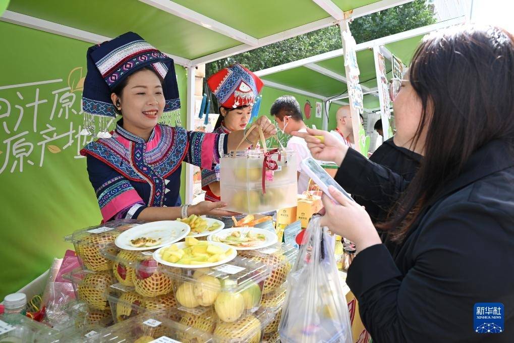 9月19日,在北京西城金融街“邮味集市”上,邮政工作人员在摊位上向消费者推介农产品。